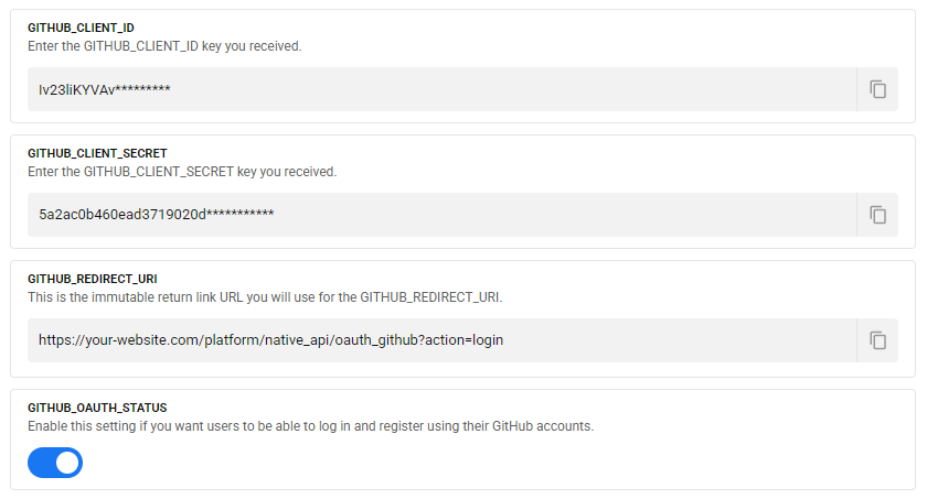 Add your credentials to the "GITHUB_CLIENT_ID and GITHUB_CLIENT_SECRET" fields on the Admin Control Center → Third-party login page.