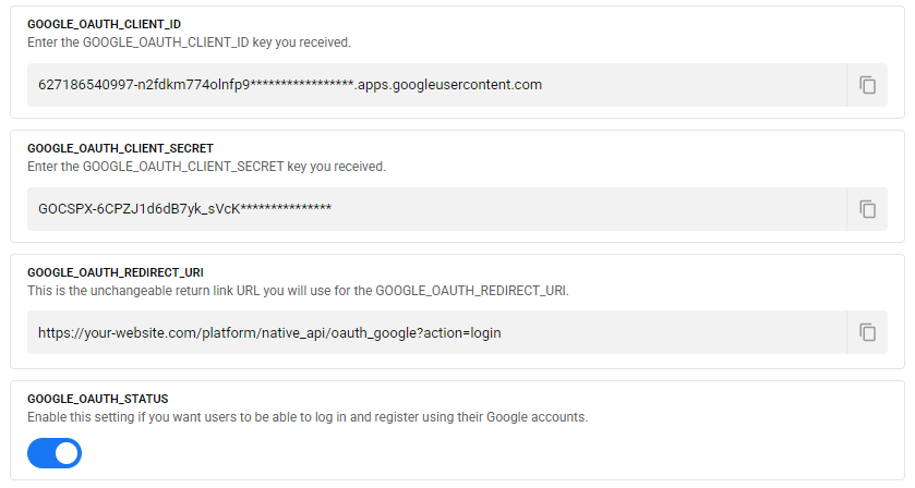 Next, to enable the Google login system: activate the "GOOGLE_OAUTH_STATUS" structure and save the changes.