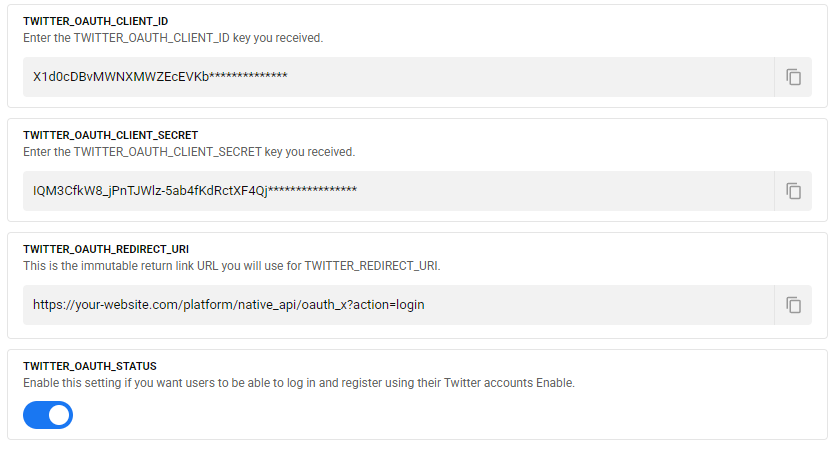 Finally, enable the Twitter (X) login system by activating the "TWITTER_OAUTH_STATUS" option and save your changes.